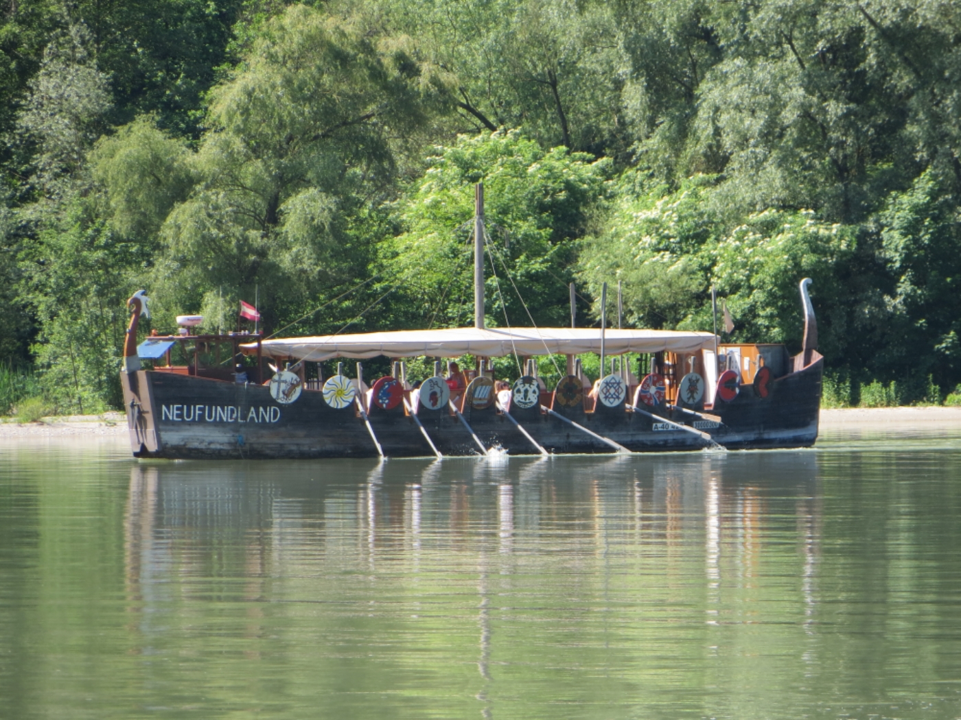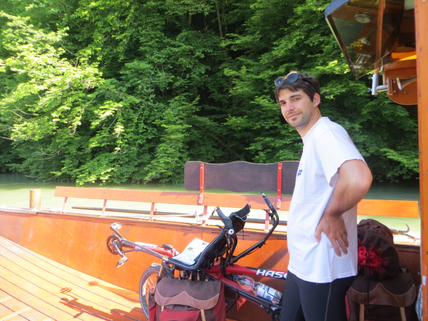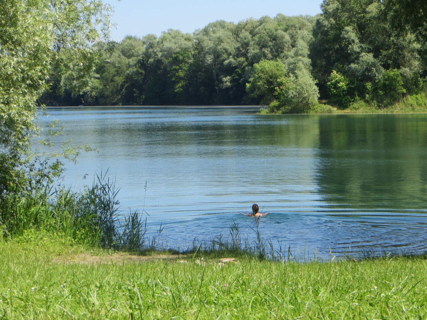 Des passages sont très beaux, avec du chemin stabilisé (ce qui change un peu du bitume parfait, finalement). On longe le Danube et ses quelques îles protégées.L’après-midi, nous passons devant un lac et décidons de tenter de faire un plouf. Juliette va vérifier la température de l’eau en plongeant pendant que je surveille courageusement le tandem. Après mon propre plongeon, je peux confirmer que la surface de l’eau était à la bonne température mais que ça refroidissait très vite.