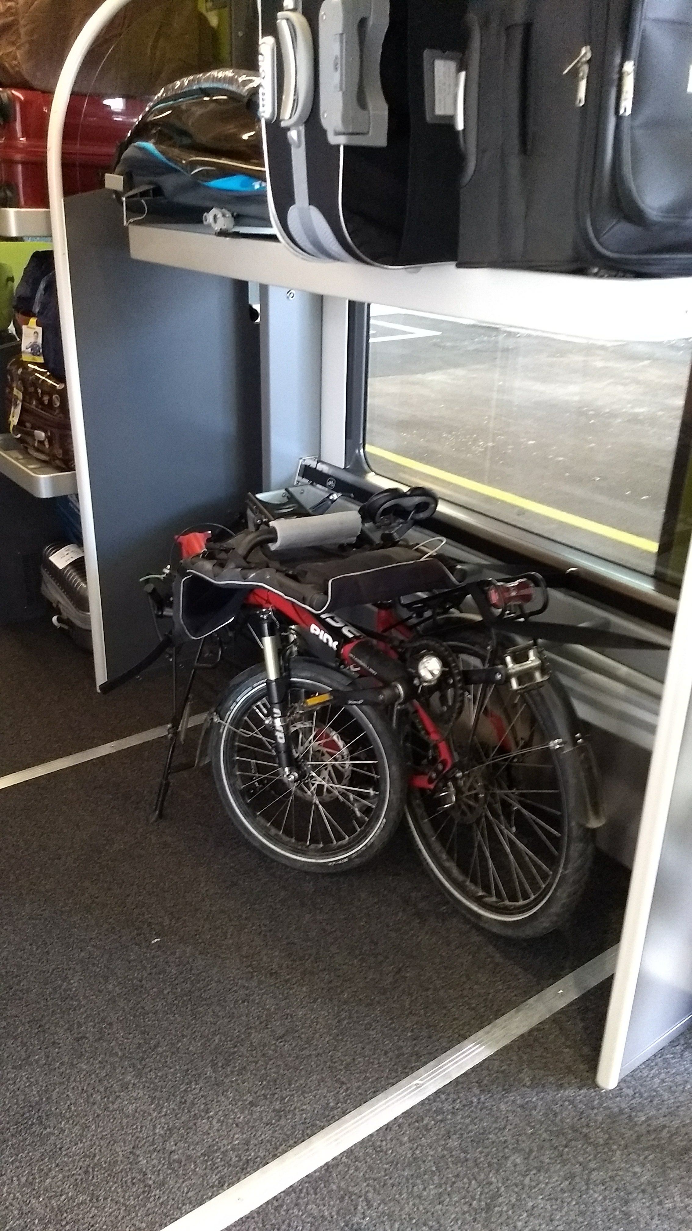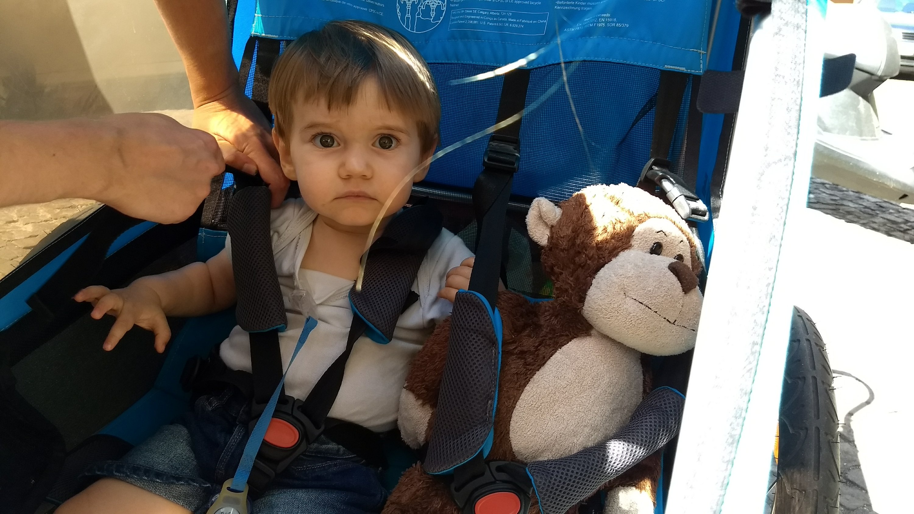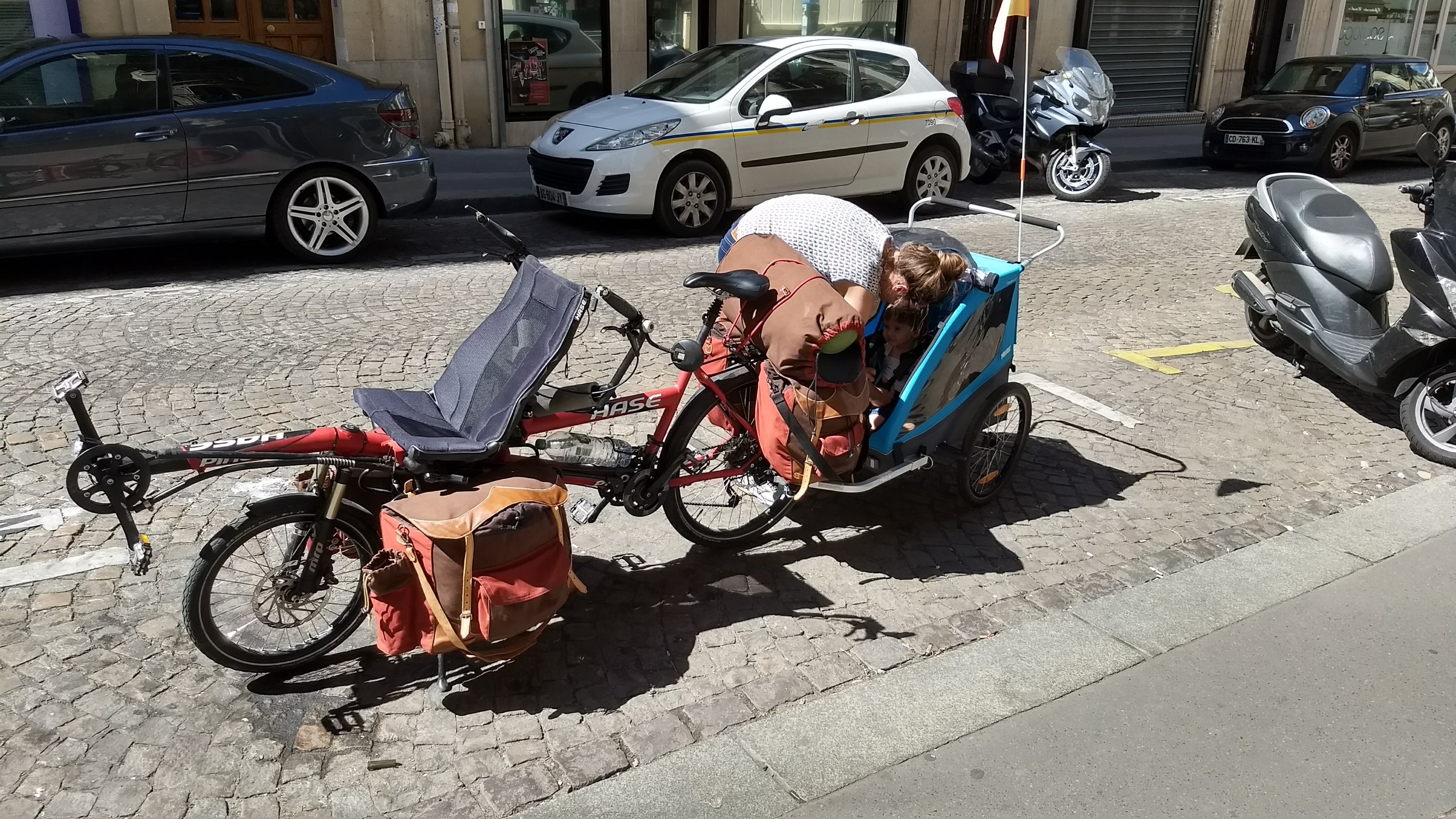 À Besançon, on coupe par le tunnel sous la forteresse. Ça change sur le paysage ! On avait prévu un arrêt chez un réparateur de vélo pour regonfler (on ne fait pas confiance à notre pompe…), mais il est fermé. C’est hélas en même temps qu’on a un premier vrai problème : Colin à vomi une grande quantité dans sa charette. Il va bien (il vomit aussi en voiture), mais les dégâts sont impressionnants. On nettoie comme on peut. Et on déprime sur notre roue arrière.